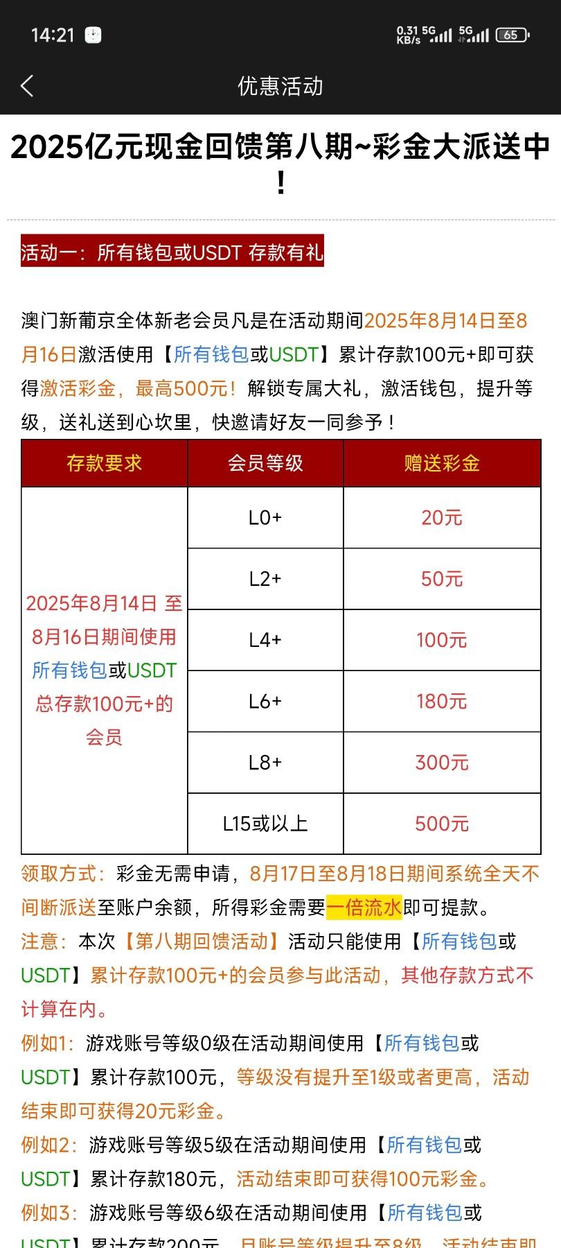 662,8月14至月16累计钱包充值100+激活钱包礼金