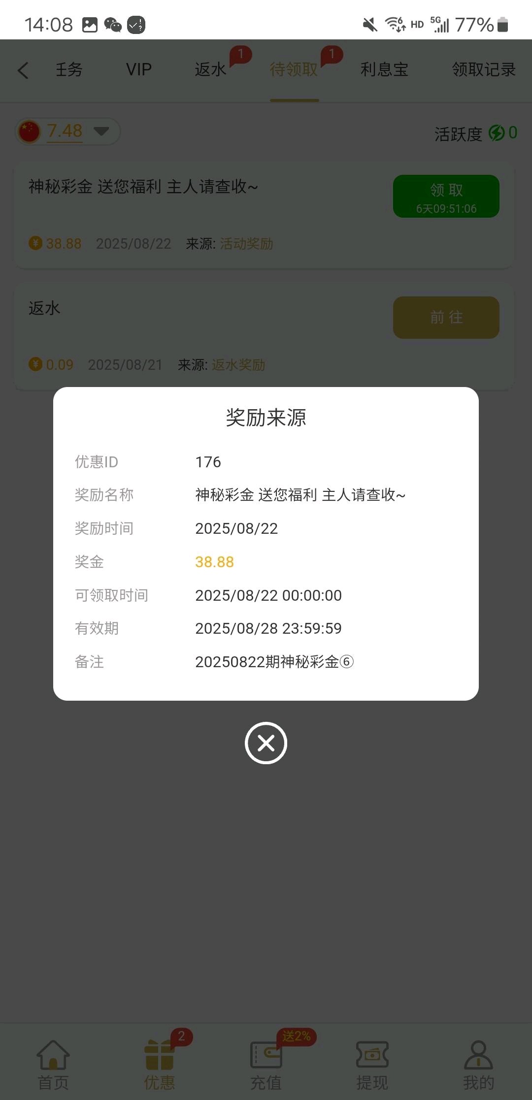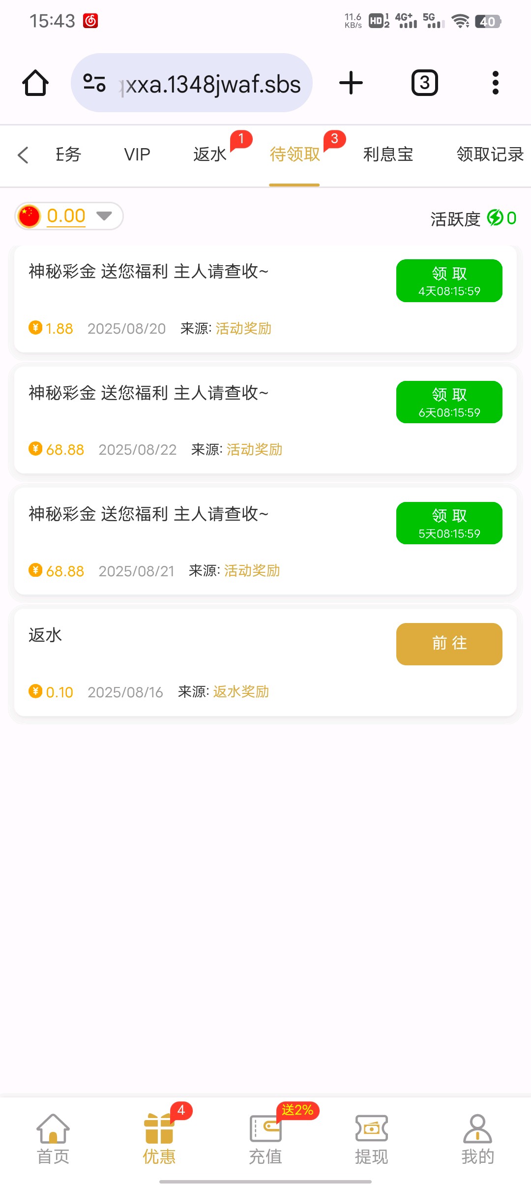 上号就有自助领取。十块二十的充过,每天抢红包抢到金额里面包含连起来的13 34 48就能申请十倍加赠。链接:1348.com