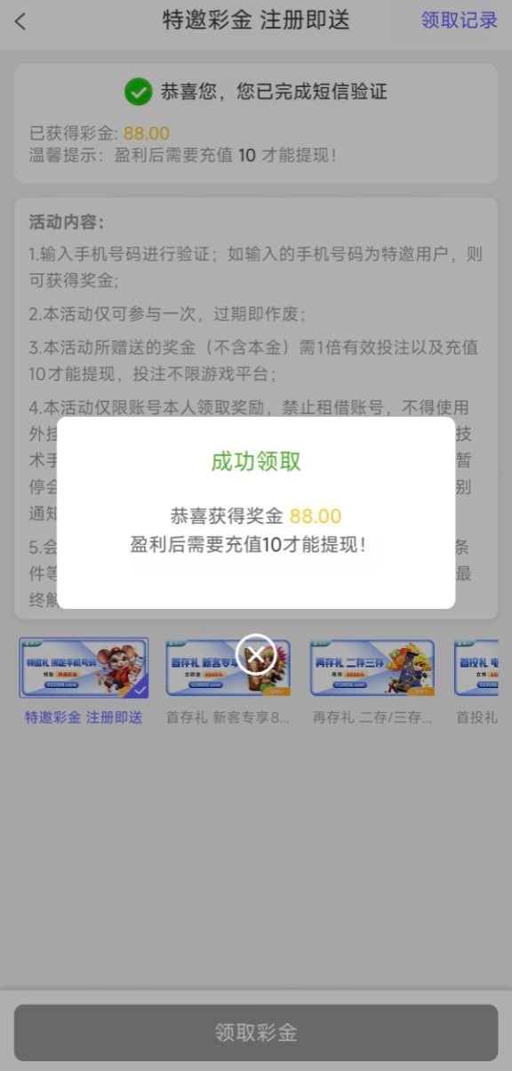 新用户注册绑定信息手机号验证是特邀秒88彩金十倍流水提现,不是特邀没有,具体自测