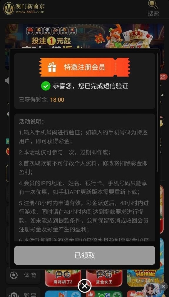 新用户注册绑定银行卡等信息,优惠里面自助领取18彩金10水180提,不是特邀没有,具体自测
